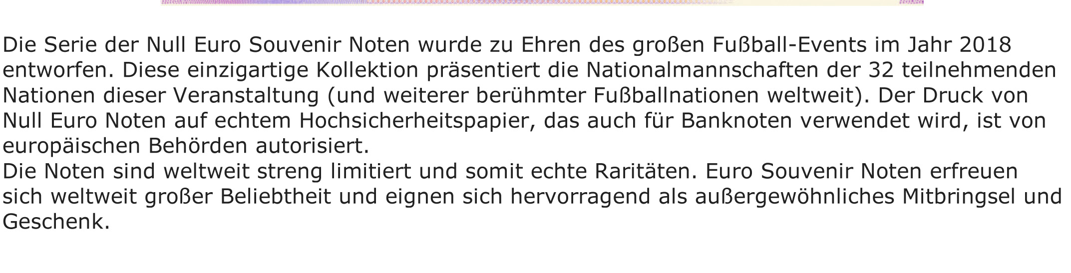 Cette collection unique présente les équipes nationales des 32 nations participantes à cet événement (et d'autres nations de football célèbres dans le monde entier). L'impression des billets Zéro Euro est sur du papier à haute sécurité, qui est également utilisé pour les billets de banque, Autorisé par les autorités européennes.